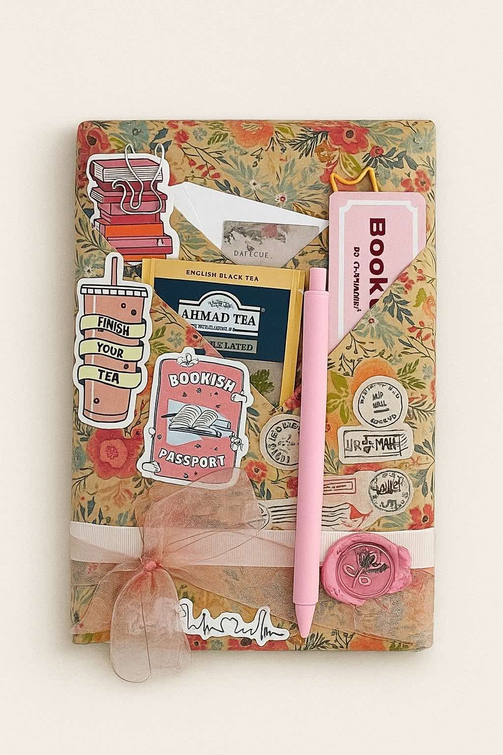 Library Card with info about the book, but not the title or author! Bookmarks, Stickers, Tea, Eye Mask, Paperclips and a Pen all wrapped in a pretty package.